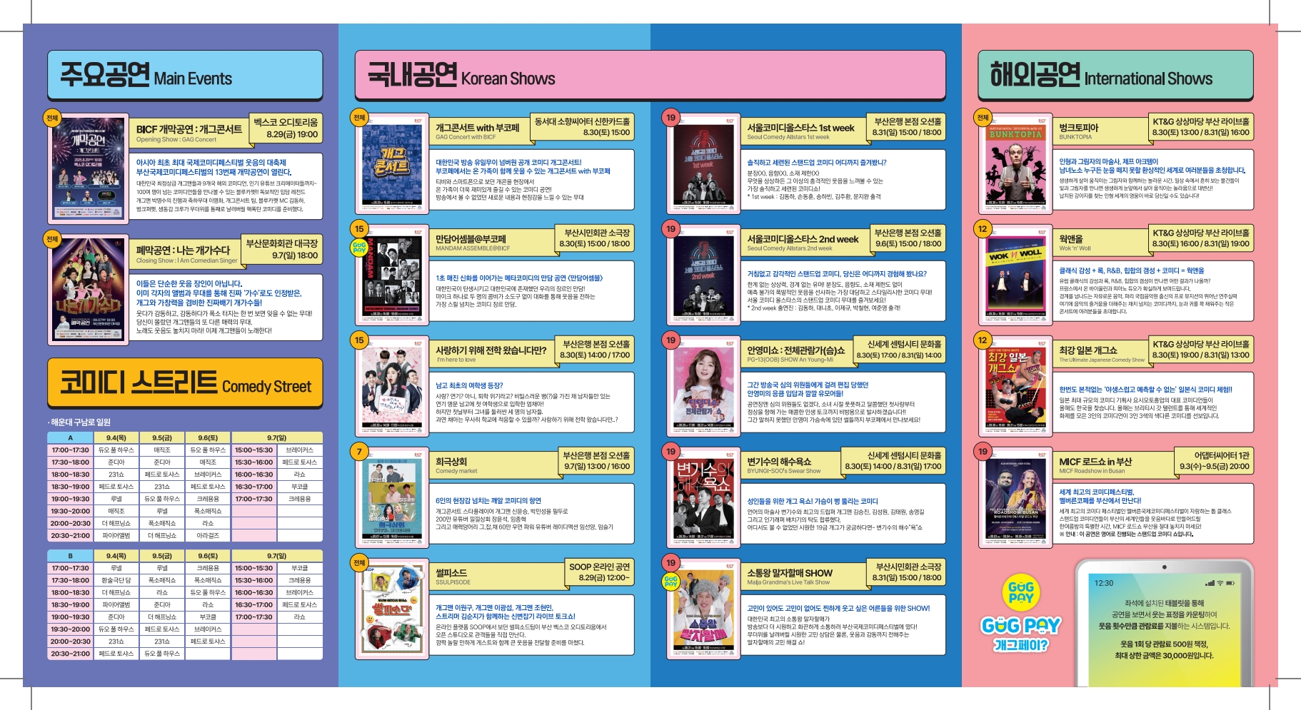 - 폐막일(9/7): 낮에는 희극상회 7, 저녁에는 나는개가수다 + 어워즈로 원데이 그랜드 코스 완성 가능합니다.