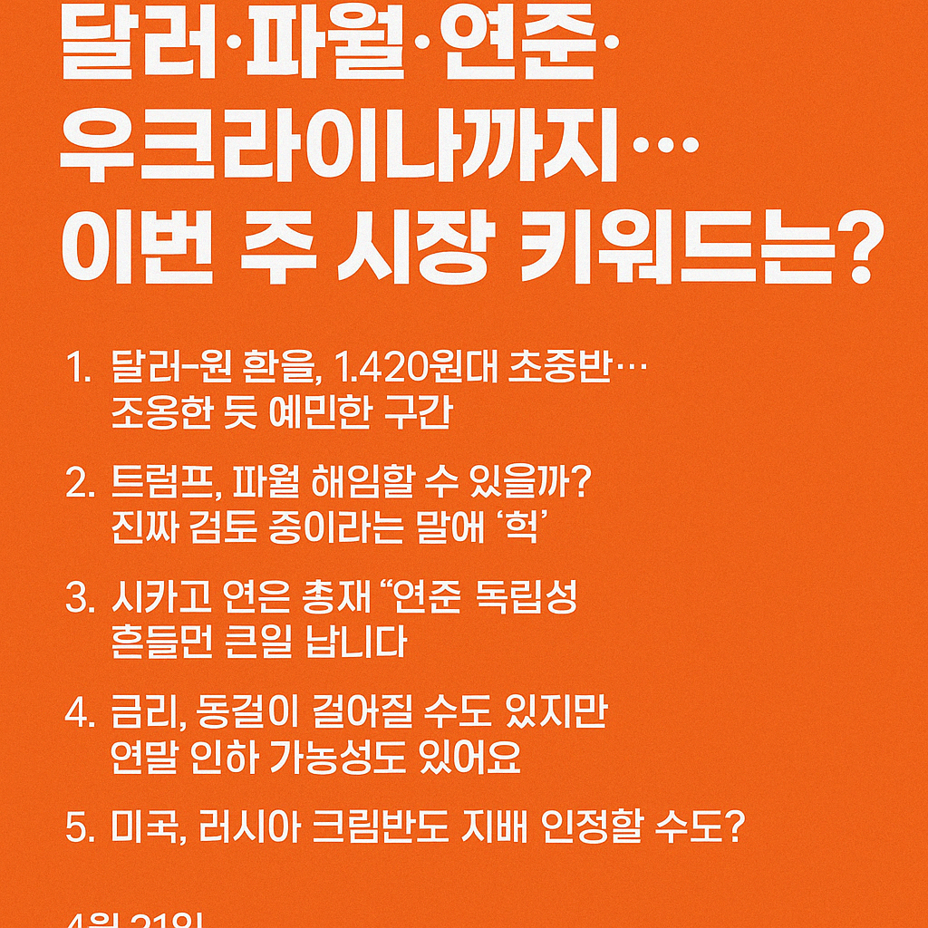 4월 21일 꼭 알아야 할 글로벌 이슈 5가지를 간단하고 자연스럽게 정리해드릴게요. 이번 주엔 환율과 연준 관련 발언, 지정학적 이슈까지 꽤 복잡한 이슈들이 얽혀 있어서 시장도 예민하게 반응할 가능성이 있어요.