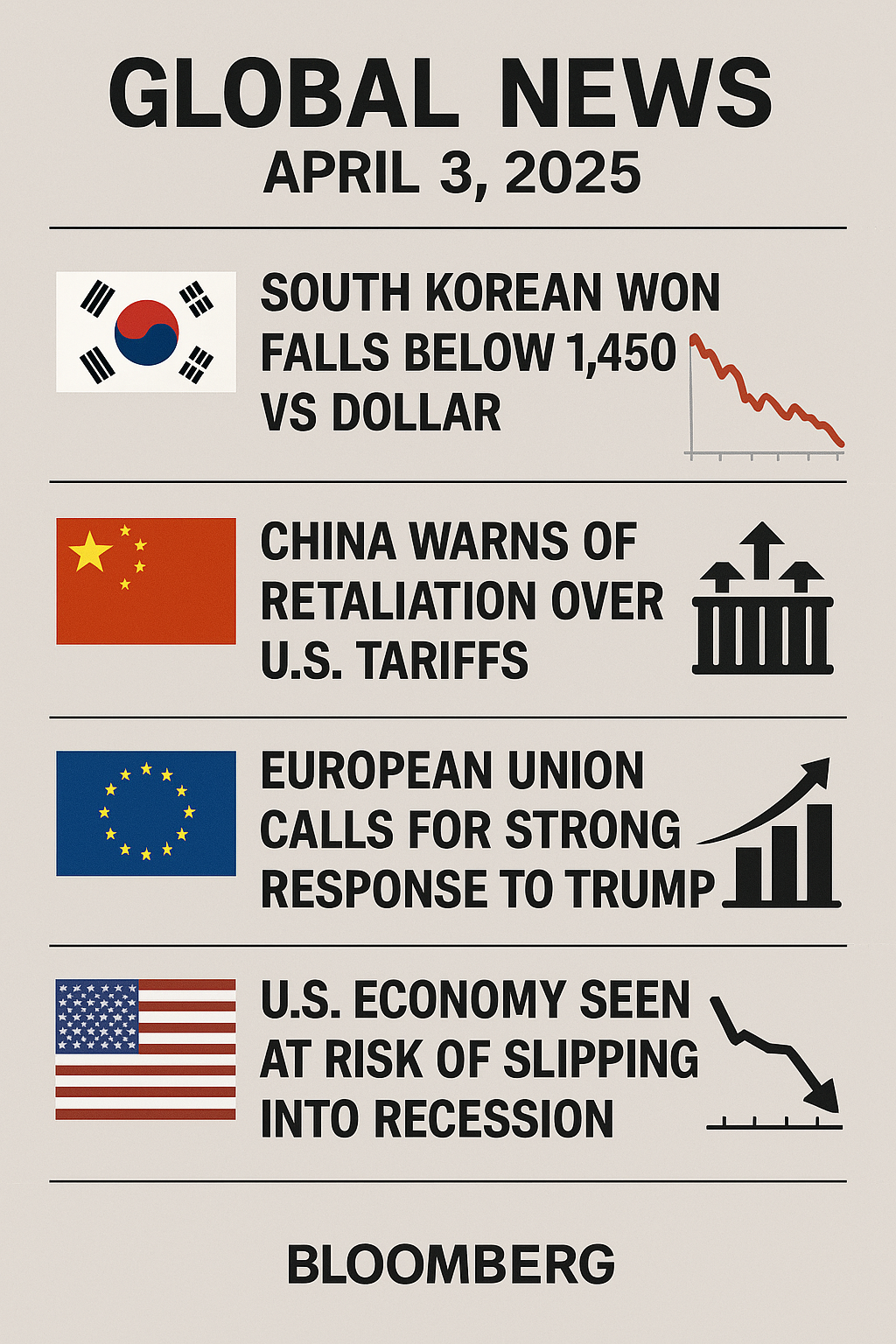 글로벌 뉴스(2025.4.3) 환율, 중국 보복 경고, EU 맞불, 미국 경제 전망에 대해 알아볼텐데요. 오늘은 특히 미국발 관세 충격의 글로벌 확산, 한국 환율과 정치 이벤트, 연준과 기업의 신중한 스탠스가 핵심 포인트입니다.