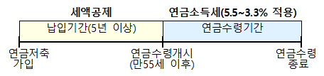 연금저축은 납입기간에는 세액공제를, 연금형태로 수령 시 낮은 세율의 연금소득세(5.5~3.3%)를 적용받게 되므로 55세 이후 노후자금을 준비하는 목적으로 유익할 수 있습니다.