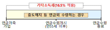 주의할 점이 있습니다. 만약에, 연금저축을 중도 해지하는 경우 세액공제를 받은 납입액+연금저축의 운용수익에 대하여 16.5%의 기타소득세가 적용되어 사실상 세제 혜택을 누리지 못하게 되므로 이점을 반드시 유의하시길 바랍니다.