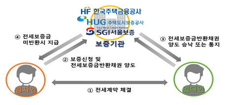 세보증금 미반환 위험으로부터 임차인을 보호하기 위해 (HF)주택금융공사, (HUG)주택도시보증공사, (SGI)서울보증보험  보증기관에서는 “전세보증금 반환보증” 상품을 판매하고 있어 이를 이용하면 됩니다.