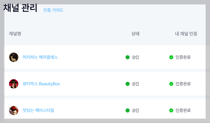좌측 메뉴에서 채널관리를 클릭합니다. 채널 등록 및 인증 팝업화면에서 자신이 운영중인 Youtube 채널을 등록하면 됩니다.