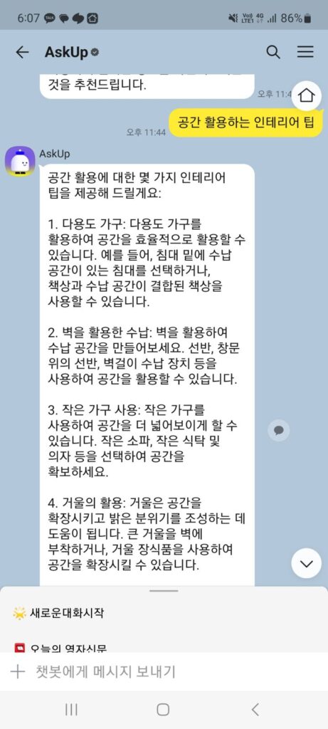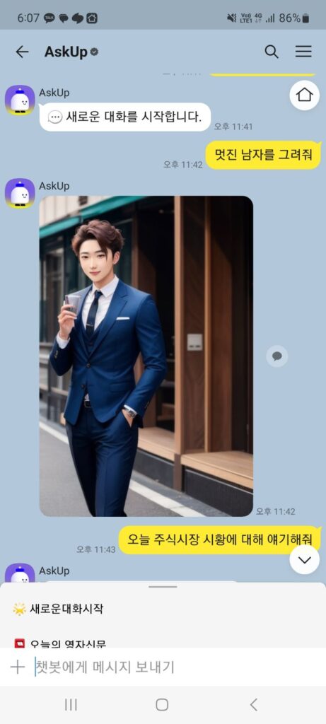AskUp은 GPT-4 모델 기반으로 만들어져 이미지 읽기가 가능한 카카오톡 챗봇입니다. 사용법은 매우 간단합니다. 1단계 카카오톡 친구 – 돋보기 클릭 – AskUp 입력 - 채널추가하면 됩니다. 2단계 사용하면 됩니다. 아래와 같이 사용하면 됩니다.