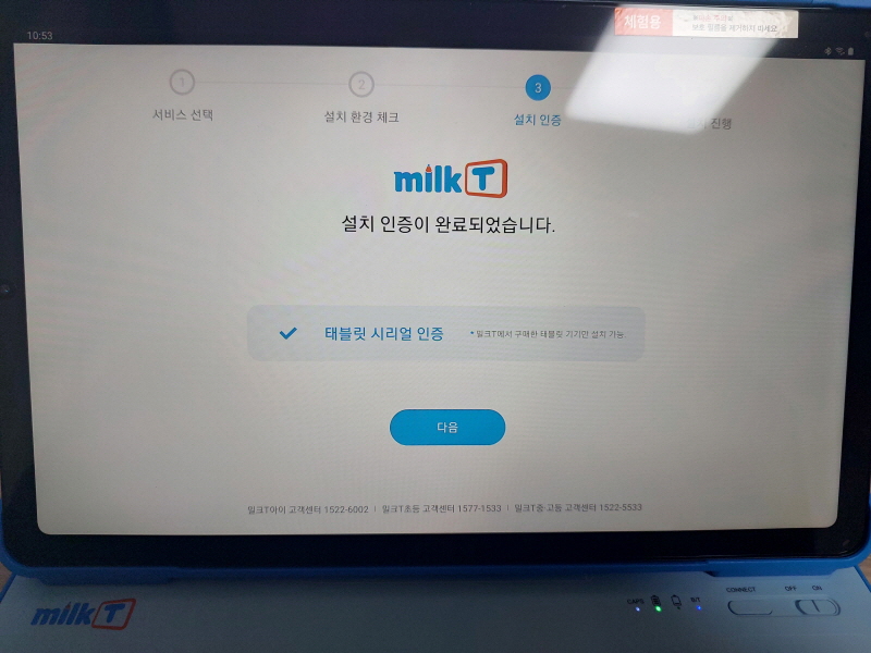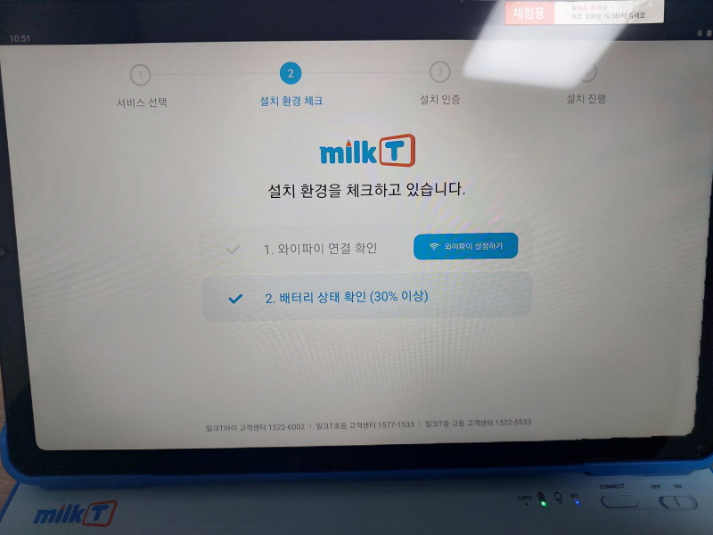 와이파이 연결과 배터리 상태, 그리고 태블릿 시리얼 인증 확인해요.