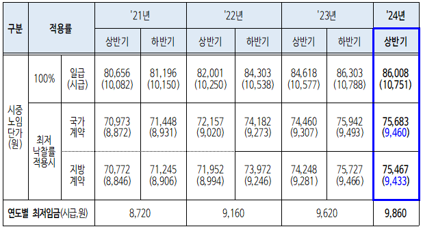 - 최저낙찰하한율을 반영할 경우, 국가계약의 경우 시급은 9,460원으로, 2024년의 최저임금인 시급 9,860원에 비해 400원이 미달합니다. 지방계약의 경우에는 시급이 9,433원으로, 2024년의 최저임금에 비해 427원이 미달합니다.