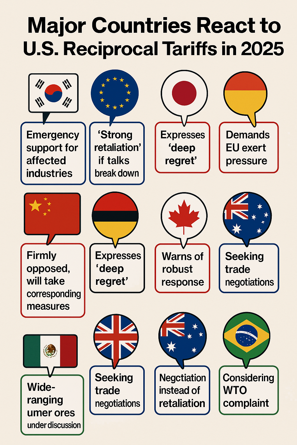 이번 포스팅에서는 2025년 트럼프 행정부의 상호 관세 발표 이후 주요 국가들의 반응을 정리한 내용입니다. 미국의 이번 조치는 전 세계 50개국 이상을 겨냥했으며, 글로벌 무역질서에 큰 파장을 일으키고 있습니다.