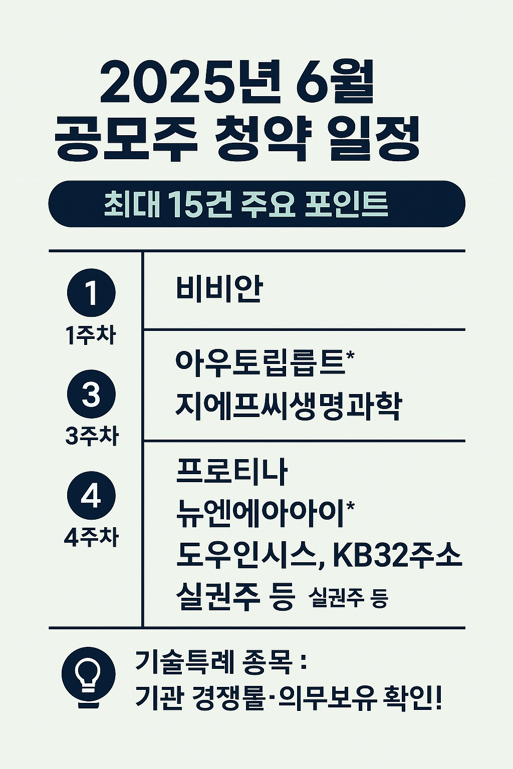 6월 공모주 일정, 벌써 챙기셨나요? 이번 달은 공모주 8건 + 실권주·일반공모 7건까지, 최대 15건이 대기 중입니다. 연기·변경이 잦은 시즌이라 일정 체크가 정말 중요해요.
