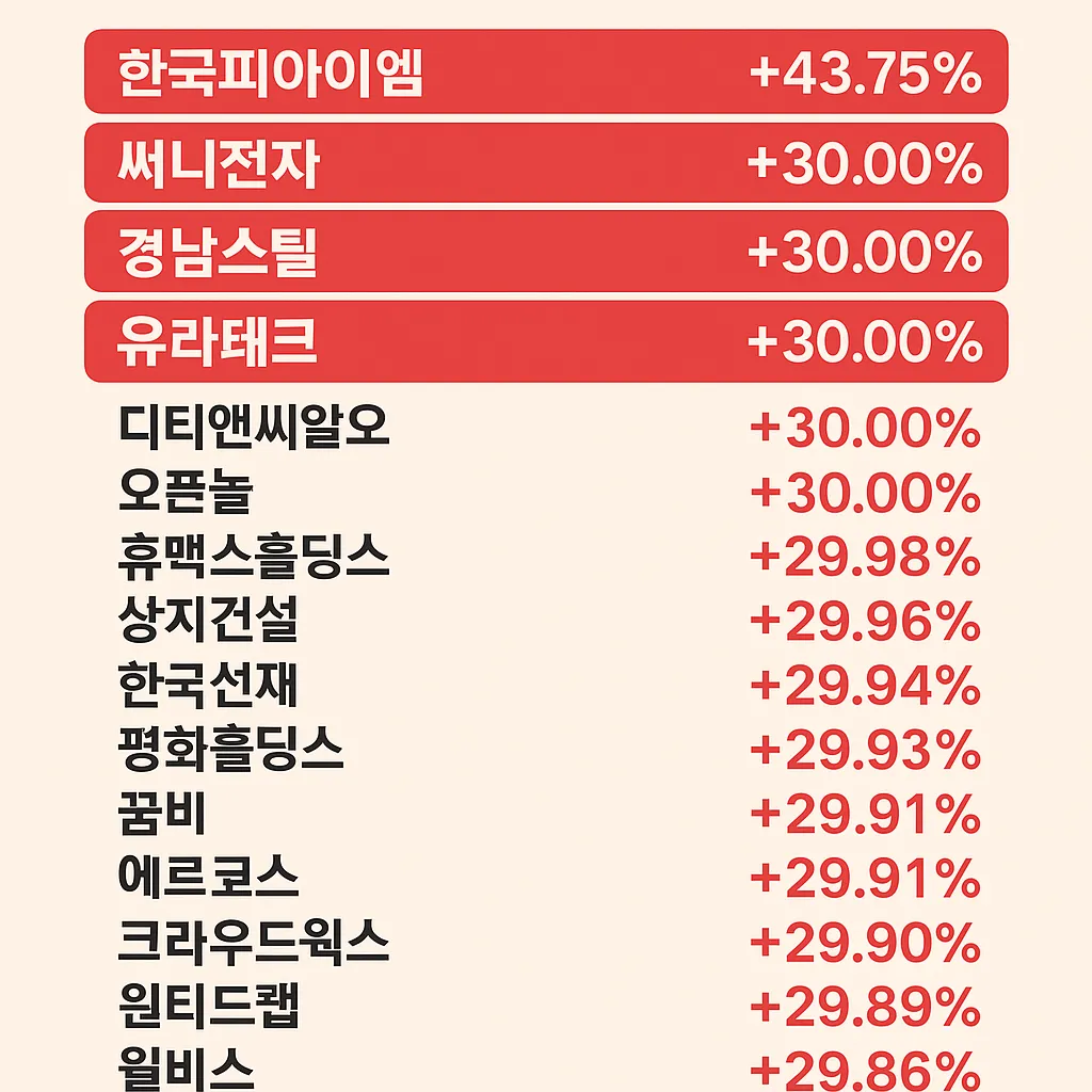 - 꿈비 (+29.91%), 에르코스 (+29.91%), 아가방컴퍼니 (+20.79%)